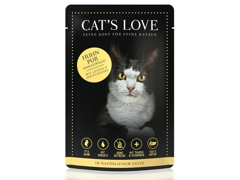 Artikelnummer: Cat's Love 1255583 Kategorien: Cat's Love, Katzen Nassfutter, Katzenfutter Schlagwörter: 0 Monate, Alleinfutter, Alleinfuttermittel für ausgewachsene Katzen, CA00085CH, Cat's Love, Huhn 71% (Hühnerfleisch, Hühnerherzen, Hühnerleber, Hühnermägen, Hühnerhälse), Brühe 27.7%, Mineralstoffe 1%, Leinöl 0.2%, Brennnessel 0.1%, Kein besonderes Bedürfnis