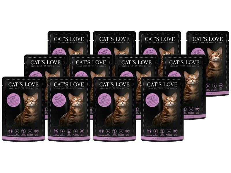 | Zusammensetzung | Lachs & Huhn 71% (Hühnerfleisch, Lachs, Hühnerherzen, Hühnerleber, Hühnermägen, Hühnerhälse), Brühe 27.7%, Mineralstoffe 1%, Lachsöl 0.2%, Petersilie 0.1% |