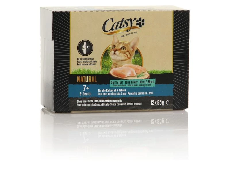 Mit 7 Jahren treten bei Katzen erste physiologische Veränderungen auf. Dank funktionalen Inhaltstoffen unterstützt Catsy Ihre Katze bei diesem Prozess. Im Futter enthalten ist Frischfleisch mit natürlich vorkommenden Vitaminen, hoch verdaulichen Proteinen und einem sehr guten Geschmack. Das Futter unterstützt die natürlichen Abwehrkräfte und danke der zusätzlichen Ergänzung mit Vitamin E wirkt es sich positiv auf die Bekämpfung der Zellalterung aus. Fisch- und Sonnenblumenöle sind reich an essentiellen Fettsäuren Omega 3 und 6 und fördern eine gesunde Haut und Haare, durch den optimalen PH-Wert im Urin wird das Risiko von Harnsteinbildung reduziert und Chondroitin und Glucosamin unterstützen die Gesundheit der Gelenke. Das Futter enthält keine künstliche Farb- und Geschmacksstoffe.