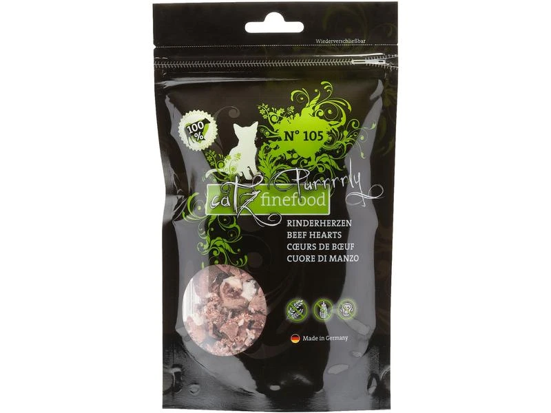Die gefriergetrockneten catz finefood Purrrrly sind pure, schmackhafte Happen für Katzen. Sie bestehen zu 100% aus Fleisch oder Shrimps und enthalten keinerlei Zusätze. Durch das spezielle Herstellungsverfahren, die Gefriertrocknung, ist der Geschmack besonders intensiv. Auch die hohe Akzeptanz spricht für sich und macht die Snacks zu einem hervorragenden Leckerli für wählerische Samtpfoten.