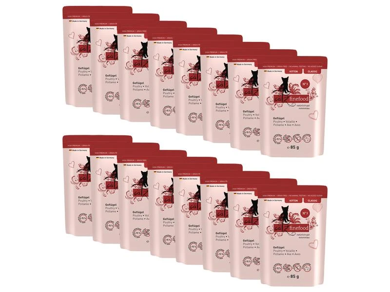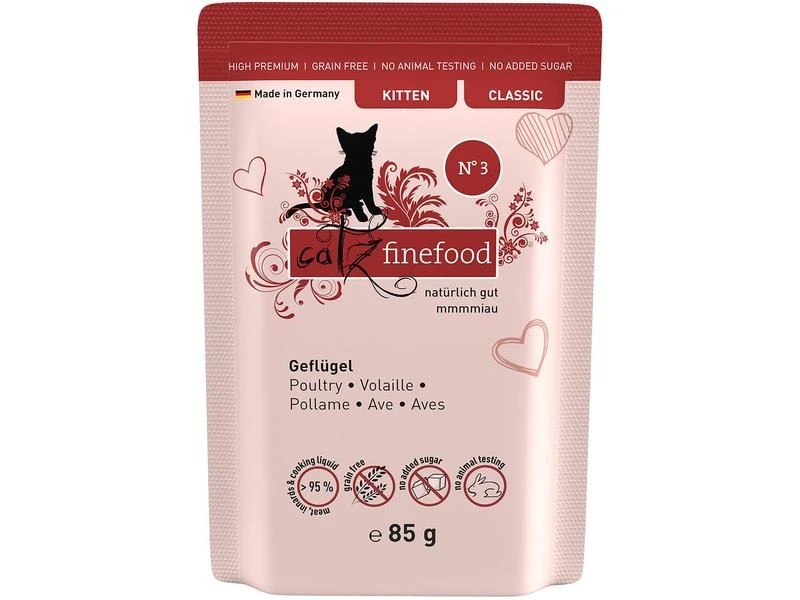 Die Rezepturen von catz finefood Classic wurden an die Bedürfnisse von heranwachsenden Katzen angepasst. Aufgrund der sehr ähnlichen Grundrezepturen wird die kleine Samtpfote schon mit dem Geschmack vertraut gemacht, den sie als erwachsene Katze in catz finefood Classic wiederfindet. Damit die kleinen Katzen das Futter einfach geniessen können, ist die Futterkonsistenz etwas feiner. Inspiration für die Rezepturen sind die natürlichen Beutetiere von Katzen, somit enthält das Nassfutter viel frisches Fleisch, Innereien und Kochsud,