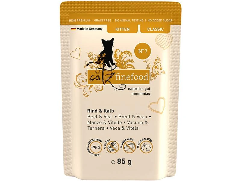 Die Rezepturen von catz finefood Classic wurden an die Bedürfnisse von heranwachsenden Katzen angepasst. Aufgrund der sehr ähnlichen Grundrezepturen wird die kleine Samtpfote schon mit dem Geschmack vertraut gemacht, den sie als erwachsene Katze in catz finefood Classic wiederfindet. Damit die kleinen Katzen das Futter einfach geniessen können, ist die Futterkonsistenz etwas feiner. Inspiration für die Rezepturen sind die natürlichen Beutetiere von Katzen, somit enthält das Nassfutter viel frisches Fleisch, Innereien und Kochsud,