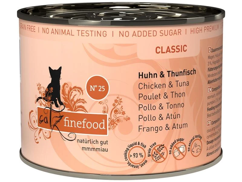 Garantiert ohne Konservierungsstoffe, ohne Geschmacksverstärker und ohne Farbstoffe. Gentechnikfrei. catz finefood ist ein hochwertiges und artgerechtes Nassfutter für Katzen, das in enger Zusammenarbeit mit Ernährungswissenschaftlern für Katzen und Tierärzten entwickelt wurde.