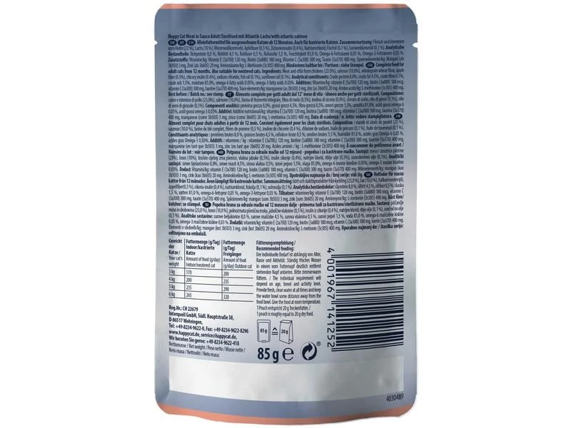 Artikelnummer: Happy Cat 1282204 Kategorien: Happy Cat, Katzen Nassfutter, Katzenfutter Schlagwörter: Adult (1-7 Jahre), Alleinfuttermittel für ausgewachsene Katzen, Fisch, Fleisch und Innereien vom Huhn (23%), Lachs (10%), Weizenvollkornmehl, Apfelfaser (0.5%), Zichorieninulin (0.4%), Natriumchlorid, Fischöl (0.1%), Sonnenblumenöl (0.1%);, Haut & Fell, Verdauung, Magen & Darm, Ohne Zuckerzusatz, Kastriert / Sterilisiert, Ohne künstliche Zusätze, Rohprotein 8.0%, Rohfett 4.5%, Rohfaser 0.5%, Rohasche 1.5%, Feuchtigkeit 81.0%, Omega-6 Fettsäuren 0.34%, Omega-3 Fettsäure 0.27%