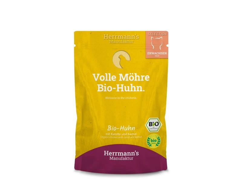 Die Herrmann’s Manufaktur überzeugt mit hochwertigem Futter in zertifizierter Bio-Qualität aus nachhaltiger Produktion in Deutschland. Für die Menüs werden ausschliesslich Zutaten aus kontrolliertem biologischen Anbau sowie artgerechter Tierhaltung verwendet.