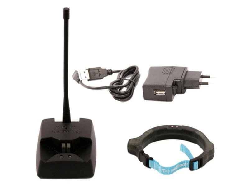 - petTracer GPS Katzenhalsband petTracer HomeStation (Ladestation & Empfänger), 433 MHz Funkantenne, USB Ladeadapter und Steckeraufsatz, USB Mini / Mikro Kabel, Verstellband mit Universalring (blau), Klebefüsse für die HomeStation (4 Stück).