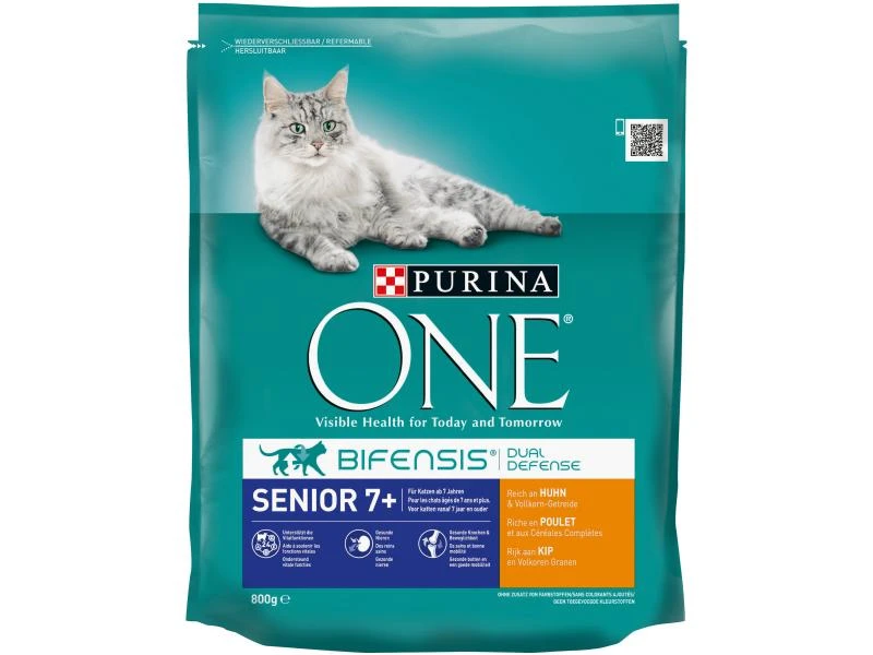 Wenn Katzen ins hohe Alter kommen, benötigen sie eine auf diese Bedürfnisse zugeschnittene Nahrung. Purina One Senior 7+ enthält 24 Vitamine und Mineralstoffe, welche die Vitalfunktionen Ihrer Katze unterstützen. Dazu gehören die Vitamine E und C, welche die gesunde Funktion der Nieren unterstützen, Vitamin D und Mineralstoffe sind wichtig für die Knochen. Die proteinreiche Rezeptur hilft zudem, die Muskelmasse zu erhalten und damit die Belastung der Gelenke zu reduzieren.