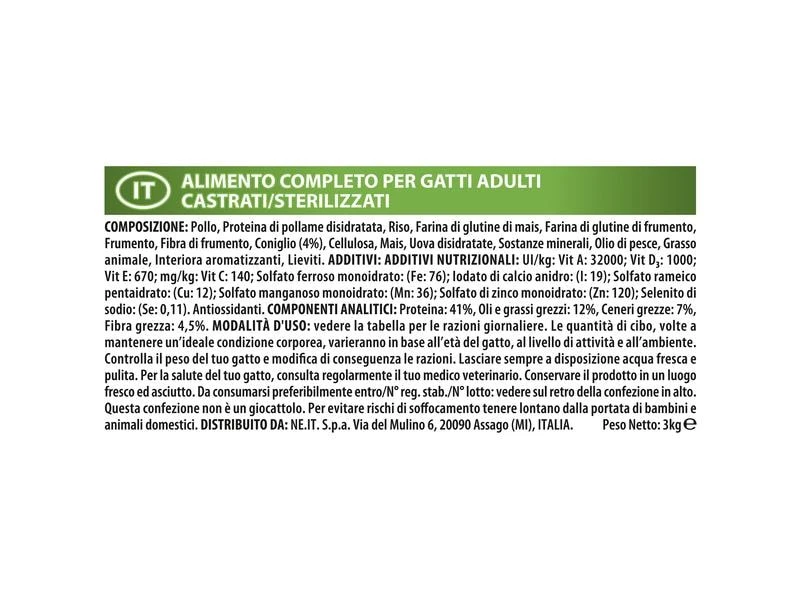 PURINA PRO PLAN STERILIZED wurde wissenschaftlich formuliert, um die spezifischen Bedürfnisse sterilisierter Katzen zu erfüllen. Hoher Proteingehalt und moderater Fettgehalt, um das Idealgewicht zu halten. Enthält OPTIRENAL , eine spezielle Kombination von Inhaltsstoffen, um das Risiko der Bildung von Harnsteinen zu verhindern und die Nierengesundheit zu erhalten.