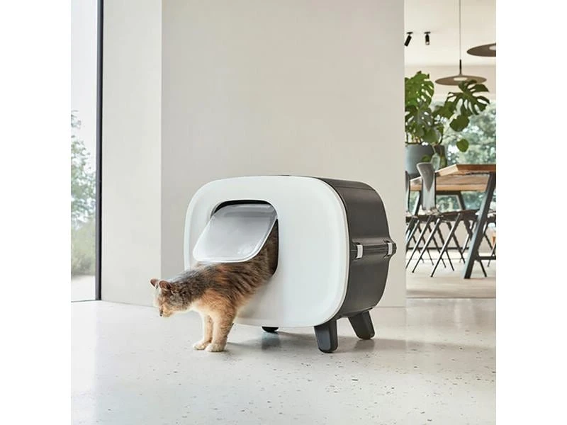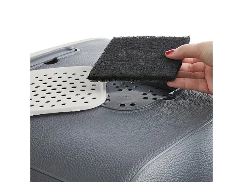 Mit der Mira Katzentoilette haben Sie endlich ein Toilettenhaus, das Sie nicht verstecken müssen! Dieses schöne Toilettenhaus verdient einen prominenten Platz in Ihrem Zuhause, denn das Design verleiht jedem Interieur Stil. Das Katzenstreuhaus ist aus hochwertigem Kunststoff gefertigt und erhält durch die Verarbeitung in Lederoptik ein luxuriöses Aussehen. Der Hochleistungs-Kohlefilter arbeitet fünfmal besser als der Filter in einer gewöhnlichen Katzentoilette, sodass Sie im Haus nicht von unangenehmen Gerüchen belästigt werden. Und dank der rutschfesten Füsse unter den vier Beinen bleibt das Toilettenhaus an Ort und Stelle und Ihr Boden bleibt kratzfrei. Um das Tablett zu reinigen, sichern Sie zuerst die Tür und öffnen Sie einfach die Frontplatte. Die Innenschale des Toilettenhauses hat rundum hohe Kanten, damit Katzenstreu und Urin sauber in der Box bleiben.