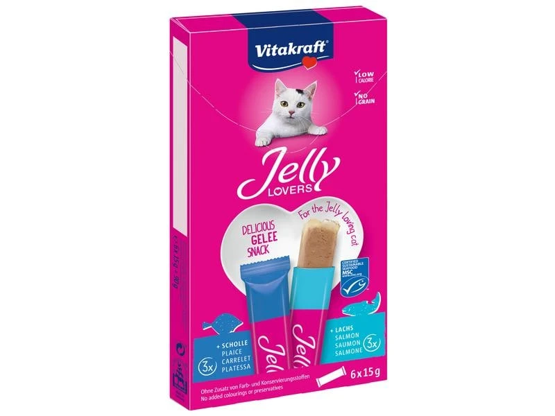 Diese Verwöhnsnacks sind ein absolutes Highlight für alle Katzen, die Gelée-Produkte lieben: Denn Jelly Lovers enthalten Sachet für Sachet eine saftige Portion Gelée zum Schlecken! Der unwiderstehliche Snack mit getreidefreier Rezeptur wird ohne Zuckerzusatz hergestellt – für unbeschwerten Genuss. Der attraktive Sortenmix mit schmackhafter Scholle und feinem Lachs bietet dem Katzengaumen zudem die geliebte Abwechslung.