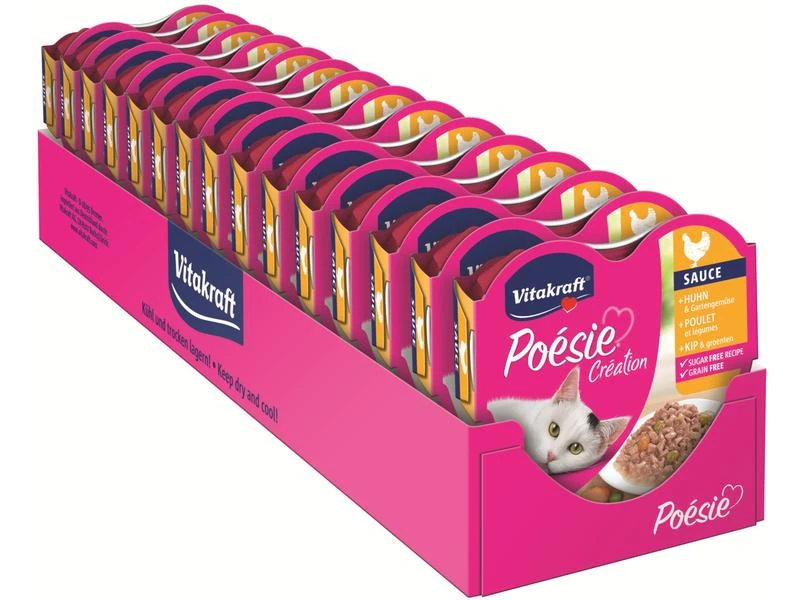 Verwöhnen Sie Ihren Stubentiger mit der Poésie Sauce von Vitakraft in der Herzschale. Das schmackhafte Menü ist auf die ernährungsphysiologischen Bedürfnisse von Katzen abgestimmt und überzeugt durch seine Qualität. Mit einer delikaten Sauce verfeinert, ist das leckere Menü jeden Tag aufs Neue ein Gedicht für Ihren Liebling. Das Nassfutter wurde schonend, ohne Zucker und ohne künstliche Farb- und Konservierungsstoffe hergestellt.