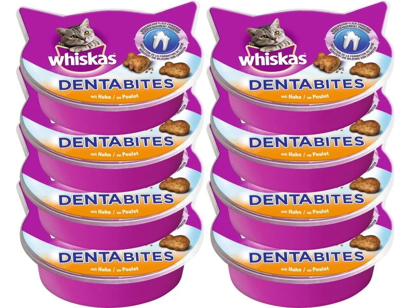 Whiskas Dentabites sind so beschaffen, dass sie die kleinen Katzenzähne im Kontakt sanft reinigen und Ablagerungen (Zahnstein) vorbeugen. Anders als viele andere Leckerli zerbrechen die Dentabites dank ihrer speziellen Textur nicht, wenn die Katze hineinbeisst. Ihre mechanische Reinigungswirkung ist daher intensiver. Aber nicht nur das, da sie auch sehr lecker sind, verführen sie selbst die wählerischste Katze spielend zur täglichen Zahnpflege